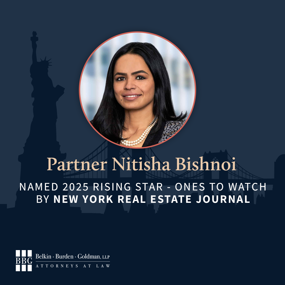 Nitisha Bishnoi, a Partner in BBG’s Litigation Department, has been named to the 2025 Ones to Watch – Rising Stars list by New York Real Estate Journal (NYREJ).