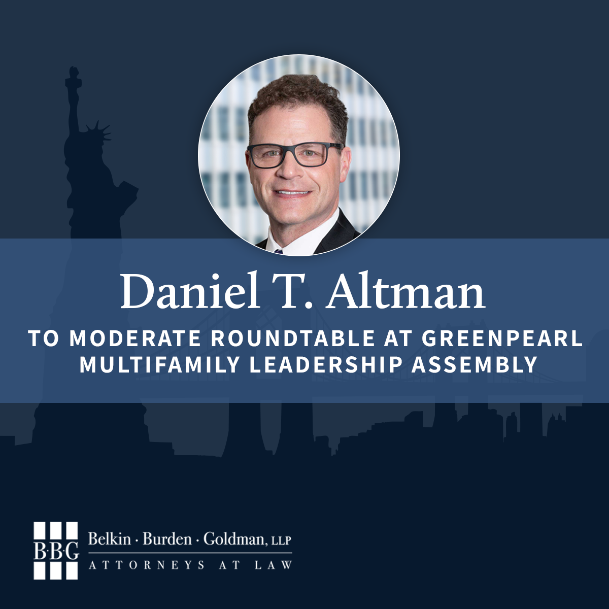 Dan Altman, Co-Managing Partner and Transactional Department Co-Chair, will moderate a private roundtable at the Greenpearl New York Multifamily Leadership Assembly, an invite-only gathering of senior leaders in commercial and residential real estate across New York, New Jersey, and Connecticut.