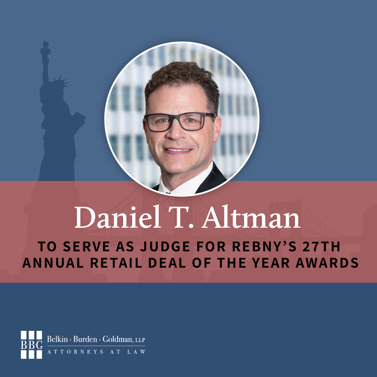 Daniel T. Altman, Co-Managing Partner and Transactional Department Co-Chair, is proud to support REBNY’s 27th Annual Retail Deal of the Year Awards, which recognizes 2024’s most innovative and impactful retail transactions across New York City. Dan was honored to be selected as a judge for this year’s event, helping to spotlight the brokers, developers, and dealmakers who are shaping the future of NYC retail.