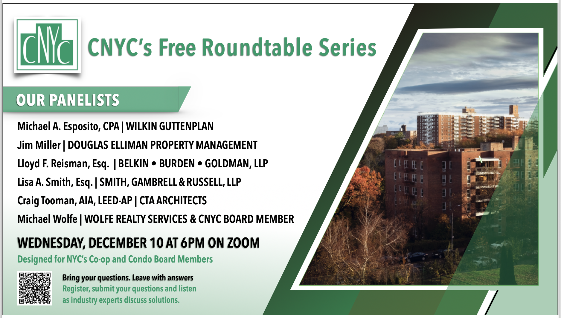 Lloyd F. Reisman, BBG partner and Co-op and Condo Law Practice Leader, will share insights and practical guidance during the upcoming Council of New York Cooperatives & Condominiums (CNYC) Roundtable for co-op and condo board members.
