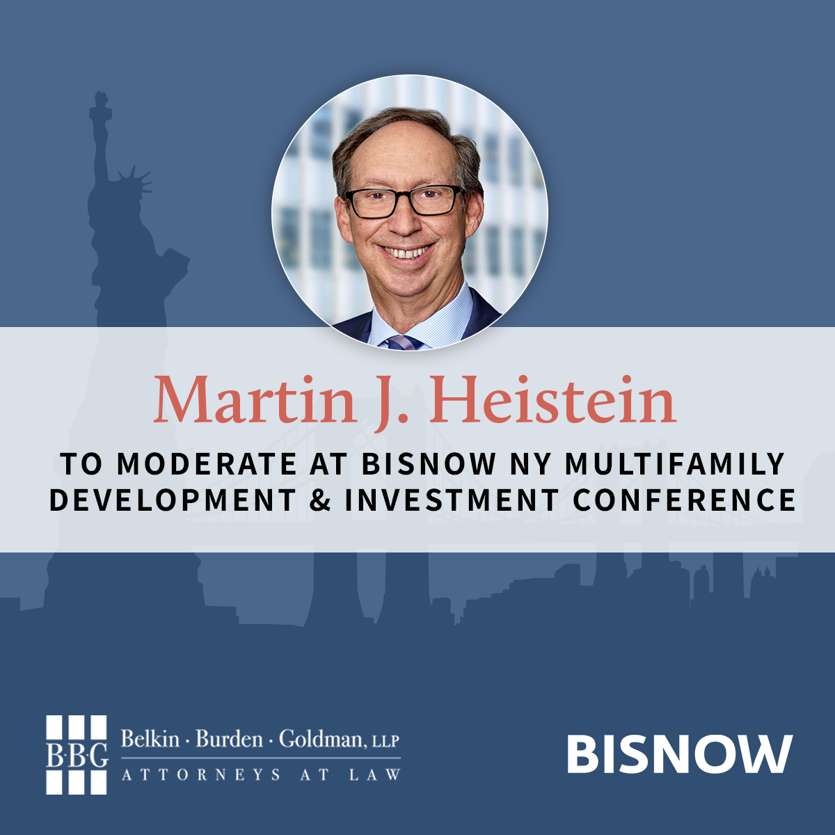 BBG Administrative Law partner Martin J. Heistein will moderate “Beyond Manhattan: Renter Trends & Their Impact on Multifamily Development Locations, Underwriting & Pricing” at Bisnow’s New York Multifamily Development & Investment Conference on Thursday, March 12, 2026 in Manhattan. The event will cover New York’s evolving multifamily landscape under a new city administration, and look candidly at the opportunities, challenges, and forces shaping the next cycle of housing growth across the five boroughs and beyond.