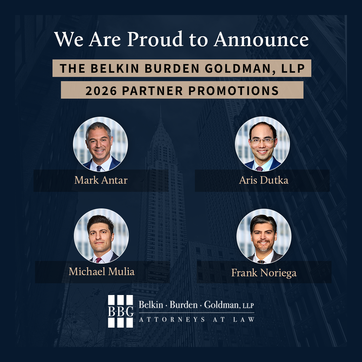 New York, NY, January 1, 2026—BBG is proud to announce the promotion of four attorneys to partner: Mark Antar in the Litigation Department, Aris E. L. Dutka in the Litigation Department, Michael A. Mulia in the Transactional Department, and Frank Noriega in the Land Use and Zoning practice. These promotions reflect each lawyer’s individual growth, excellence, commitment to client service, and growing leadership within the firm.