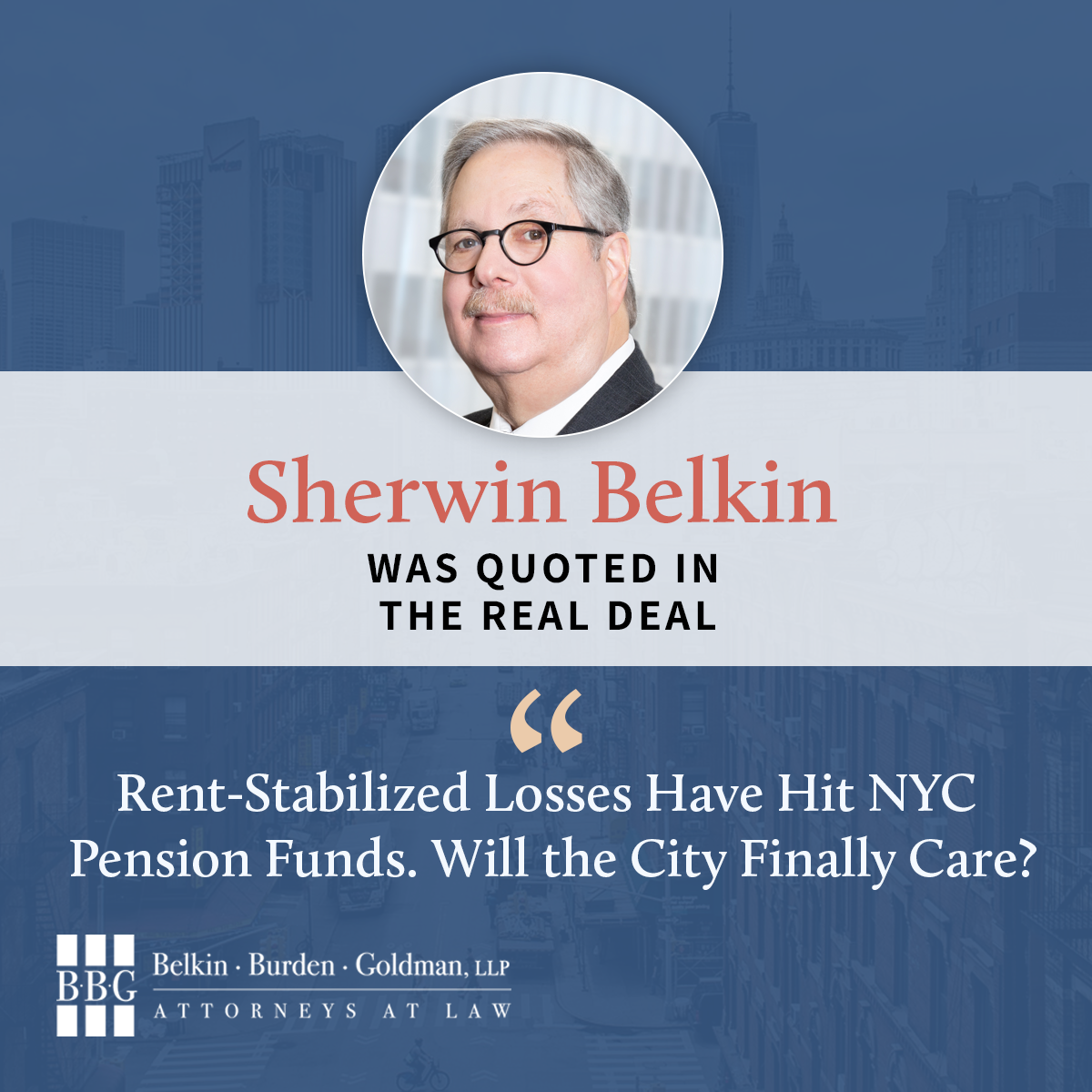 Sherwin Belkin, founding partner of Belkin Burden Goldman, LLP, was quoted in Quinn Waller’s The Real Deal article which examines how the negative effects of the Housing Stability and Tenant Protection Act (HSTPA) of 2019 has impacted NYC’s pension fund, which has invested in rent stabilized properties.