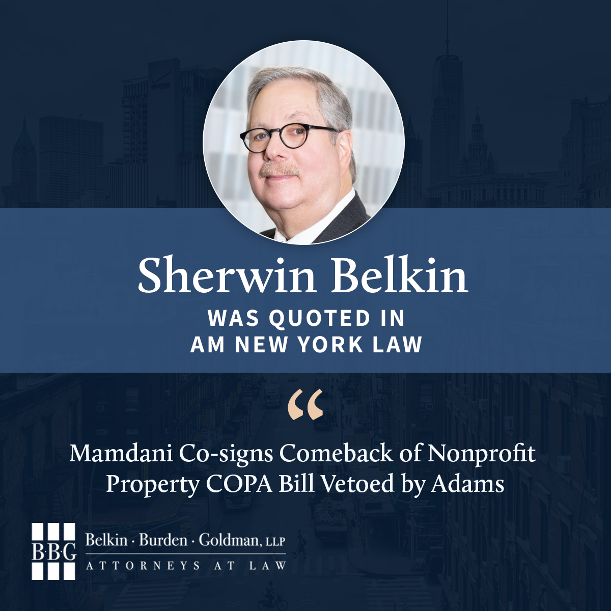Sherwin Belkin, founding partner of Belkin Burden Goldman LLP, was quoted in Isabella Gallo’s article in amNewYork Law, which examines the effort to revive the Community Opportunity to Purchase Act (COPA) after it was vetoed by former Mayor Eric Adams.